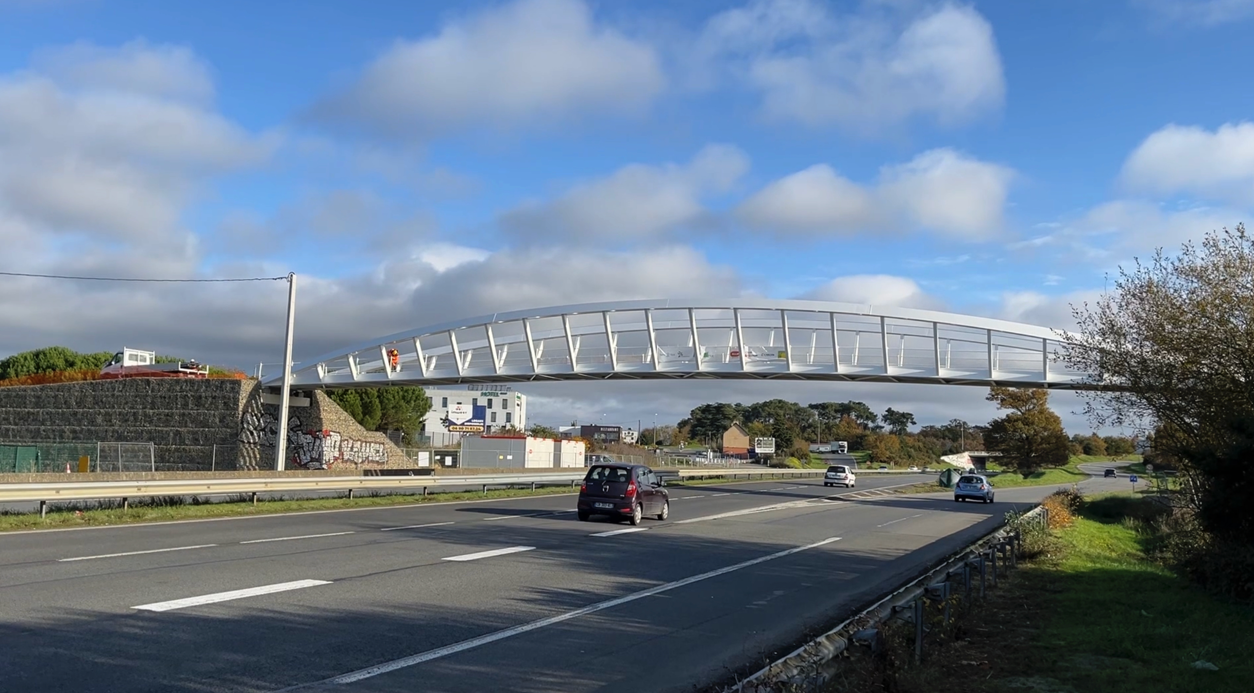 Récemment mise en place, la structure est encore en phase de finalisation avec des aménagements en cours de part et d'autre de l'ouvrage. Cette installation répond à un besoin de sécurité important pour les usagers de deux-roues qui, jusqu'à présent, "sont obligées d'emprunter deux ronds-points très dangereux pour rallier Kerlann".