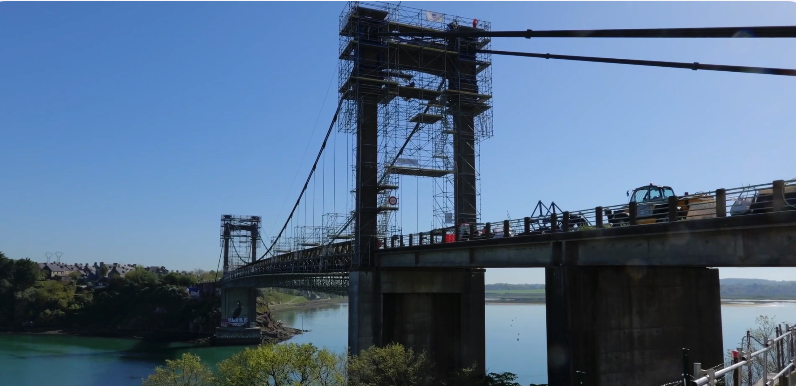 Le chantier porte principalement sur le remplacement intégral des câbles de suspension de l'ouvrage. Dans un premier temps, des câbles provisoires sont mis en place afin de maintenir la structure pendant les opérations de démontage. Le tablier mesure 175 mètres et pèse environ 1 400 tonnes. L'installation de ces câbles temporaires implique des travaux de terrassement conséquents, comme l'explique l'un des responsables du chantier :