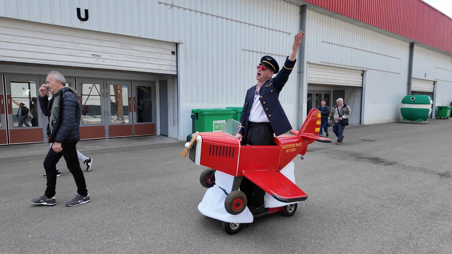 Aujourd'hui, c'est à bord d'un avion qu'Olivier Brius a traversé les allées de la Foire de Rennes. Un déguisement monté sur un chariot électrique, lui permettant de circuler facilement en interagissant avec les visiteurs.