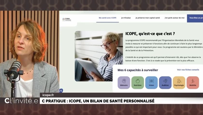 C Pratique : ICOPE - Dans votre chronique C Pratique, nous vous présentons le programme ICOPE, crée par l'OMS. ICOPE : un bilan de santé personnalisé. Le Dr Gériatre Séverine JUCHS nous présente ce programme d'auto évaluation. www.icope.fr et www.monbilanprevention.sante.grouv.fr